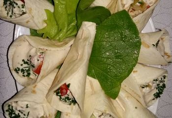 pieczarka smażona, ser żółty, surówka, sos kminkowy. Wkładane